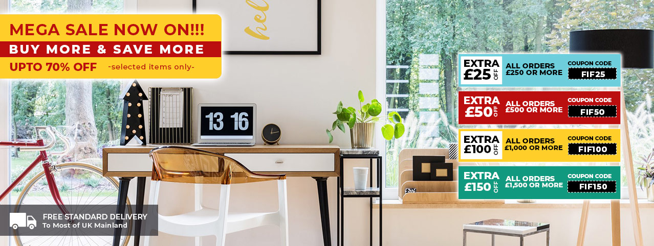 Office Desks & chairs, computer workstations allow you to work from home! So browse our amazing furniture collection today. Lighting latest styles are available for lamp, floor, wall & ceiling lights. In chrome, brass & metal. Storage need to get organised? We have shelving, boxes, cupboards & shoe cabinets! Chest of drawers in all styles. Affordable Bathroom furniture sets are available with basins & wall units. Discounts! So that we can offer the most competitive price in the market we have excellent discount vouchers! The more you spend the more you save! We have a Furniture Sale category where we offer warehouse furniture clearance stock from all departments. We offer free standard delivery to most of UK mainland on all items which include VAT. So, what you are waiting for? Buy now from one of the UK’s largest and best discount furniture outlet.
